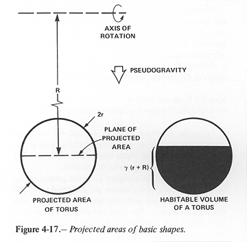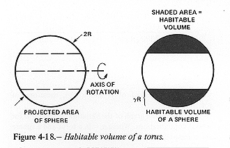 In a torus with 1 g at its outermost circumference, habitable volume is the shaded area of the tube revolved around the axis of rotation. The formulas for these volumes are given in table 4-6.