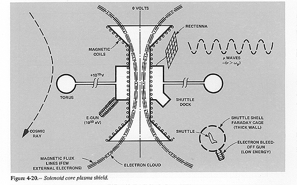 A plasma core shield is a variant of the plasma radiation shield discussed in reference 31. Figure 4-20 shows a toroidal habitat with an "electron well" at the hub. Inside this well about 10^3 C of electrons spiral along lines of magnetic force, and hold the metallic habitat at a positive potential of 15 billion volts. The enormous electrostatic potential repels the protons and other cosmic ray nuclei from the habitat, and cuts off the cosmic ray spectrum for energies below 7.5 GeV/nucleon (15 GeV for protons). With this cutoff the net radiation dose, including secondary production, is below the acceptable dose of 0.5 rem/yr.