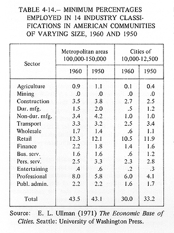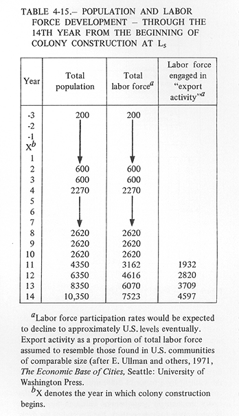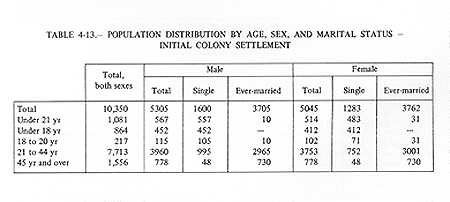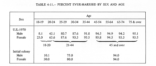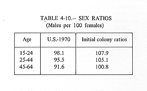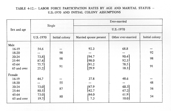 The U.S. population as described in the 1970 Census is used as a basis from which the colony properties are derived. The sex ratio is increased by about 10 percent in favor of the males and it is assumed that there is a substantial shifting of the population out of the more dependent ages - from under 20 and over 45 - into the 21-44 age class. Other assumptions include an increase in the participation of married women in the labor force and some fairly serious adjustments in the marital status distribution, all of which are directed toward increasing the proportion of the population in the effective workforce. These data are shown, with some comparable statistics for the United States, in tables 4-9 to 4-13.