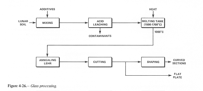 A simplified diagram of industrial glass-making is given in figure 4-26 with lunar soil listed as the raw material to be provided.