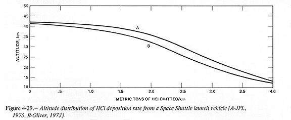 Hydrogen chloride gas (HC1) produced from the exhaust of the Space Shuttle booster motor (see fig. 4-29) dissociates to produce free chlorine which, in turn, reacts to remove ozone from the stratosphere by the following catalytic reactions: