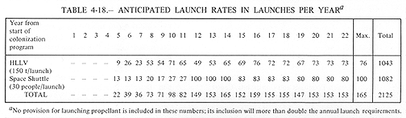 One-dimensional models of HC1 deposition, vertical transport, and chemical production and removal of participating trace stratospheric constituents (OH, O, O(l D), 03 , CH4, H2, and NO) have been used by NASA to simulate ozone depletion (refs. 45, 46). Steady-state solutions were obtained simulating 60 shuttle launches per year given that the emissions were spread uniformly in the horizontal over a hemisphere and over a 1000-km wide zone. The levels of ozone reduction computed were about 0.3 percent and 1.0 percent, respectively. More recently, Whitten has revised the ozone depletion calculation for the hemisphere downward to less than 0.1 percent (personal communication, July 1975). Launch rates that might be anticipated for the initial colonization program are shown in table 4-18.