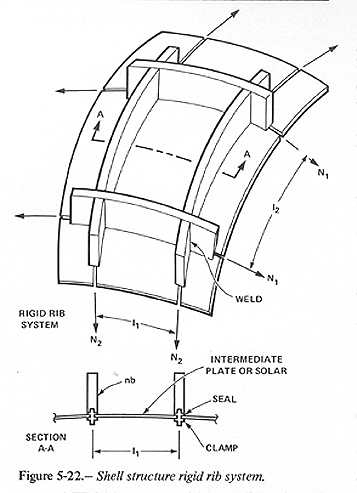 A section from a symmetric structural shell transmitting only normal stresses in orthogonal directions may be designed either as a stressed skin or a rib system. The stressed skin is the most efficient in that the same material carries the stress in both directions and there is integral resistance to secondary torsional and bending loads. In addition, both fabrication and construction generally are simplified and problems with sealing joints, finishing, and maintenance are reduced.