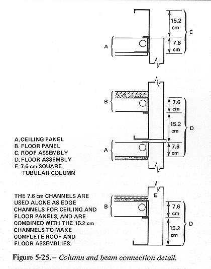 The structural system consists of aluminum tube columns with a typical 4 X 6 m bay size. Beams are also aluminum, spaced at 2 m on center. Beams and columns have fixed connections to form rigid boxes, allowing them to span up to 6 m. Figure 5-24 shows this structural frame assembly and figure 5-25 details the beam and column connections.