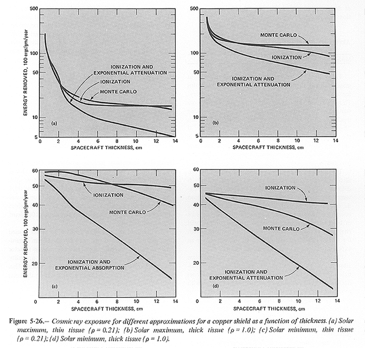 The calculation of a mass shield can only be properly done by Monte Carlo simulation of the various pathways that the interactions can take. Two approximations often used either assume that secondary particles supplement nuclear attenuation well enough that only electron excitation stops the beam (the "ionization" approximation); or that secondary particle creation is negligible, resulting in beam attenuation by both nuclear attenuation and electron excitation ("ionization + exponential" approximation). Figure 5-26 plots the exposure rate versus all three formulations of shielding effectiveness for a cosmic ray spectrum incident on a copper shield. As the shield thickness becomes greater than approximately one mean free path length (for nuclear attenuation) the Monte Carlo result begins to show behavior that parallels the slope of the ionization + exponential approximation. The remaining difference is that the Monte Carlo result is a scale multiple of the ionization + exponential curve. This behavior then provides the following new approximation: