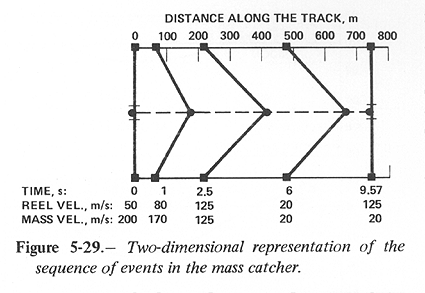 The time history of a payload and the rigs is shown in a two-dimensional representation in figure 5-29 and is detailed as follows: The payload enters the catcher area with a velocity v = 200 m/s where it is decelerated constantly by 30 m/s^2. When its velocity reaches 20 m/s it is released to a storage depot attached to the rear end of the catcher frame. The reel assemblies and net motions are divided into three stages: