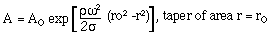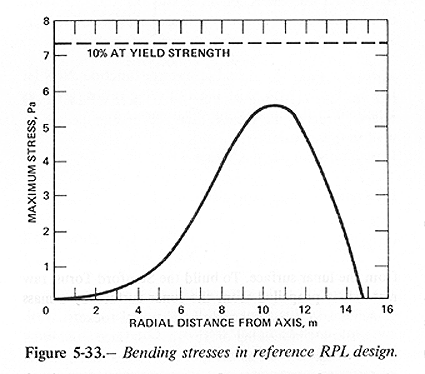 and d^2 is proportional to A. A plot of a as a function of radial distance from the axis is given in figure 5-33. Note that for the reference design, the stress is maximum some 2.44m inward from the point where the tube ceases to taper. But even at that maximum, the stress is only some 7 percent of the yield stress for Kevlar. Stress relief may be provided by making the tube ellipsoidal in cross section.