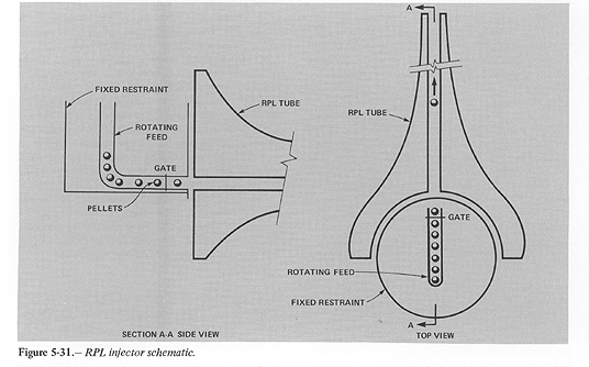 To achieve thrust, the RPL must be made to release its pellets with approximate uniformity in direction. This may be accomplished with the pellet injector of figure 5-31. The feed tube rotates at the same rate as the RPL tube, pressing a pellet against the restraint. There is a hole in the restraint which lets a pellet through when the tubes are pointing in the right direction. A gate in the feed tube, controlled by a cam, ensures that only one pellet goes through at a time. Use of the gate means that the hole need not be small.