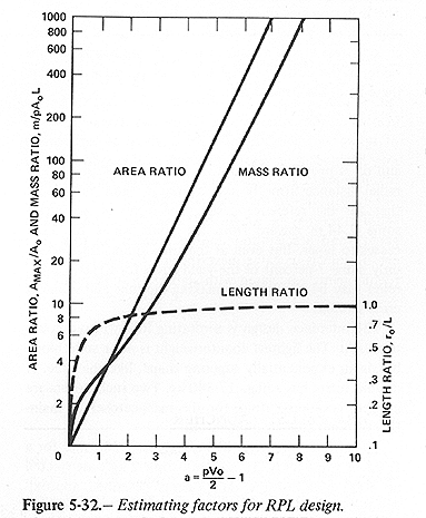 The rotary pellet launcher (RPL) is a heavy tube rapidly rotating so as to accelerate small pellets of rock. The tube consists of a straight, nontapered section near the end and an exponentially-tapering section inward toward the hub from the nontapered section (see fig. 5-31). The notation is: