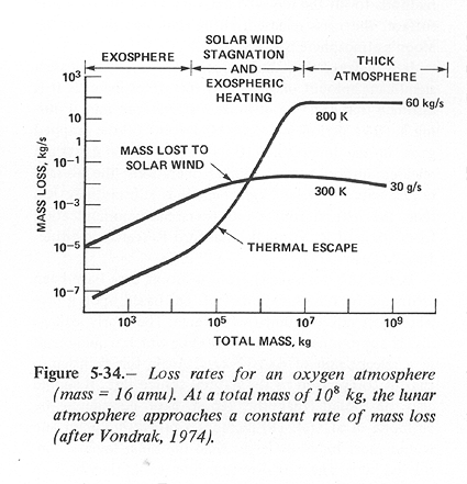 The present lunar atmosphere, arising from natural sources with a total rate less than 0.010 kg/s, has a mass of less than 10^4 kg and surface number densities less than 10^7 /cm^3. The primary mass loss mechanism is due to the interplanetary electric field resulting from the motion of the solar wind. This causes rapid loss of gases to the lunar exosphere within 10^6 to 10^7 s. This loss has been confirmed by observations of lunar module exhaust gases (refs. 28, 29). If the atmosphere is dense, however, the cleansing effect of the solar wind decreases and thermal escape becomes the dominant loss mechanism due to the relatively higher collision rate among particles. The comparative effectiveness of these two loss mechanisms is illustrated in figure 5-34 for an oxygen atmosphere.