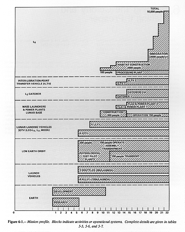 These factors lead to the mission timetable which is summarized in figure 6-1. In brief, the schedule provides for 5 yr research on Earth, 3 to 5 yr for development and testing in orbit near Earth, 5 yr to build up operations on the Moon and at L5, 6 yr for habitat construction, and a final 4 yr for completion of the shield and the immigration of the colonists. The overall schedule projects a 22 yr completion of the colony from the start of the project. Specific details of this schedule for the space colony are given in the tables listed below: