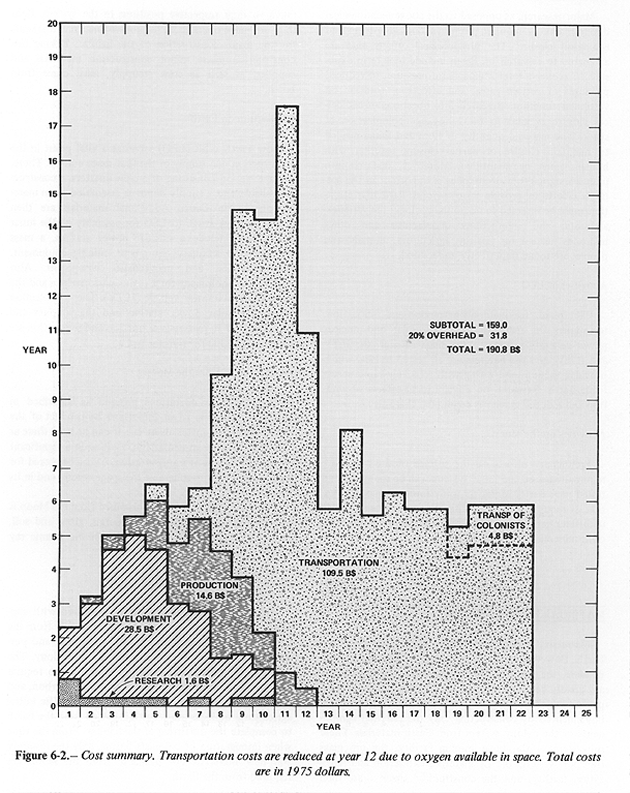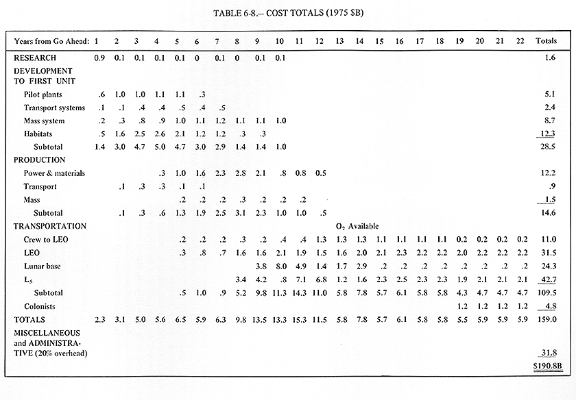 These results are summarized in figure 6-2. In addition, the total costs are given as: research, $1.6 billion; development, $28.5 billion; production, $14.6 billion; and transportation, $114.3 billion. Including a 20 percent overhead charge of $31.8 billion, the total cost of the system is thus $190.8 billion, where all costs are expressed in 1975 dollars Figure 6-2 also shows that the availability of oxygen in space dramatically reduces the transportation costs which are still over half of the total system costs. A detailed breakdown of these cost data is given in table 6-8.TABLE 6-8 (gif format)