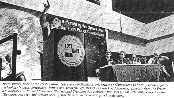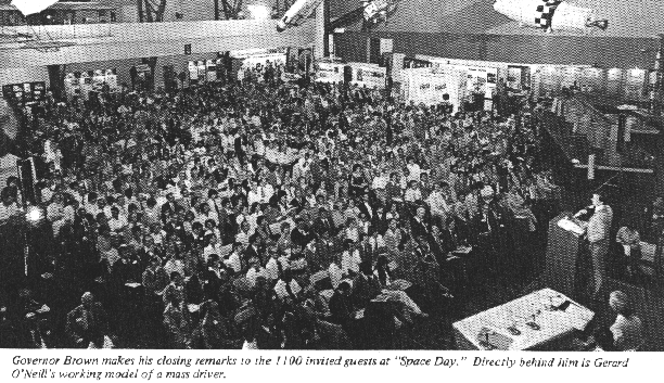 The event was organized by Russell Schweickart, on loan to the Governor from NASA, and cosponsored by the state and the aero-space industry. It got widespread news coverage because 1) Brown had always been seen as strictly Mr. Era-of-Limits, 2) the Carter administration was giving signs of reducing the NASA budget, 3) it was the summer of the phenomenal success of the film "Star Wars'', and 4) Brown was the first major political figure to offer a national vision of space adventure since President Kennedy.
