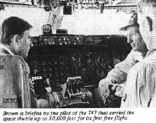 Gerry is in the left front seat, his wife Tasha in the right, of a Piper Cherokee. It's night. We're at about 6,000 feet. The two of them are navigating like mad - twitching dials, jotting figures, muttering into the transceiver which is shrieking back, glancing down at the town-lit coastal fog that has slightly complicated this flight of ninety miles from Los Angeles to Mohave. All of us (there's Jane McClure as well, wide-eyed on her first small plane flight) are grey with fatigue from Governor Brown's "Space Day", facing still the small-hours interview you just read, a wink of sleep, and a dawn drive to Edwards Air Force Base for the space shuttle free flight test.