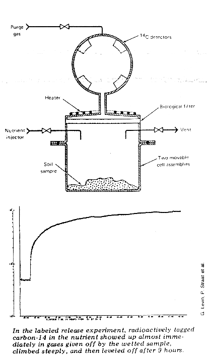 So it's really dry stuff. Basically we're talking about a slight amount of water vapor, measured in preciptable microns, where on the Earth it's centimeters. Now, the labeled release experiment shows some incorporation. What they're looking for is release of the radioactivity as radioactive 14CO2. In other words, they're adding radioactive food and looking for radioactive waste products. And indeed they got radioactivity in the form of 14CO2 coming off, and I think they got more released than with the "sterilized" sample. But, again, you don't know whether you're releasing natural radioactive C-14 in the soil, or what kind of chemistry is going on in the components of the medium. This labeled release experiment is another one that can be essentially imitated in the laboratory in a non-living way. You can just add chemicals until you release radioactivity. So both of those experiments are too hot and too wet, and have alternative interpretations, and neither of them are giving you the kind of complex response you get if you tried to monitor even a desert soil on earth.