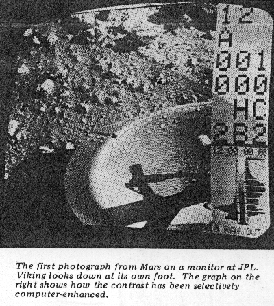 At Carl Sagan's invitation I covered the Viking I landing for CQ. (The last time I stayed up all night was my last [deleted] meeting years ago.) It was a psychedlic occasion once again as Mars gradually came through all that press equipment and muddle and took over. The first photo of the Martian surface, which came immediately after landing, was electrifying. You felt you could reach out and touch those rocks - how far away?