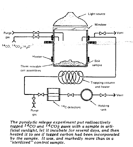 Margulis: Both, yeah, with the exception of Horowitz's, which is only too warm. You've got three of them. The first is the gas exchange experiment. That's Vance Oyama's experiment. The whole concept of monitoring gases is I think basically an excellent one, but the problem with that particular experiment is that it's only been run by moistening the soil with one of the most complex media I've ever seen. It has I don't know how many components, all kinds of organic compounds and vitamins-dozens of different things in that medium. That's the "chicken soup." They moistened the soil, and then they monitored the gases above it. Now, if you do that on the Earth you get a whole profile of gases being removed for respiration, and being produced, and metabolism - you get a whole lot of gas exchange going on. What they found is that as soon as the moisture hit that Martian regolith (I say regolith instead of soil because to me soil is a very organic thing that's the word they use for the moon covering) . . . as soon as it hit that, you got this production of oxygen, relatively large, about 15 times what would have been expected, and most people feel that you've got some sort of peroxide, or some kind of oxygen-holding material in the sample that released the oxygen on wetting. In fact Phil Ponnamperuma (he's an incredible guy) may have already been able to simulate this result with very very dry peroxide-containing material. You add water and you heat it up and oxygen is eliminated. The exact Martian simulation isn't known, but most people feel that it's a chemical response to the adding of the water. Also it may or may not have anything to do with the complex medium.