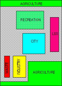 The ring will receive sunlight through its ceiling, and will obviously not present transverse views of the opposite part of the structure as in the cylinder where the sky is simply the other side of the world and there is no horizon. In accordance to this, the distribution criteria has taken into account that city areas should be adjacent to parks and agriculture and away from industry and waste processing facilities.