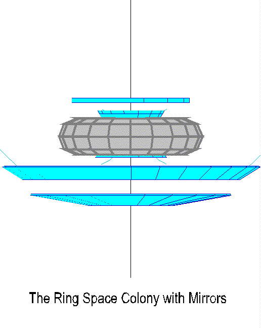 In the case of the ring sunlight will enter naturally through the ceiling. This seems to be the most natural arrangement, and it helps from the point of view of radiation shielding. The ring will be oriented in such a way that its axis of rotation is always parallel to the orbital path. In this way mirrors are uniquely placed for both sections of the ring. Because light will enter the ring in an opposite direction from the Sun's rays, it will help in adequate shielding.