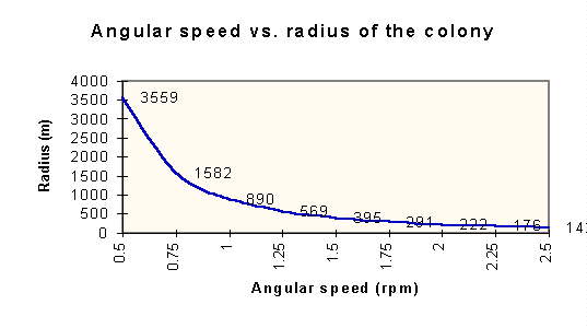 Different combinations of the radius R of the structure and the angular velocity w can generate 1 g (9.81 m/s2) :