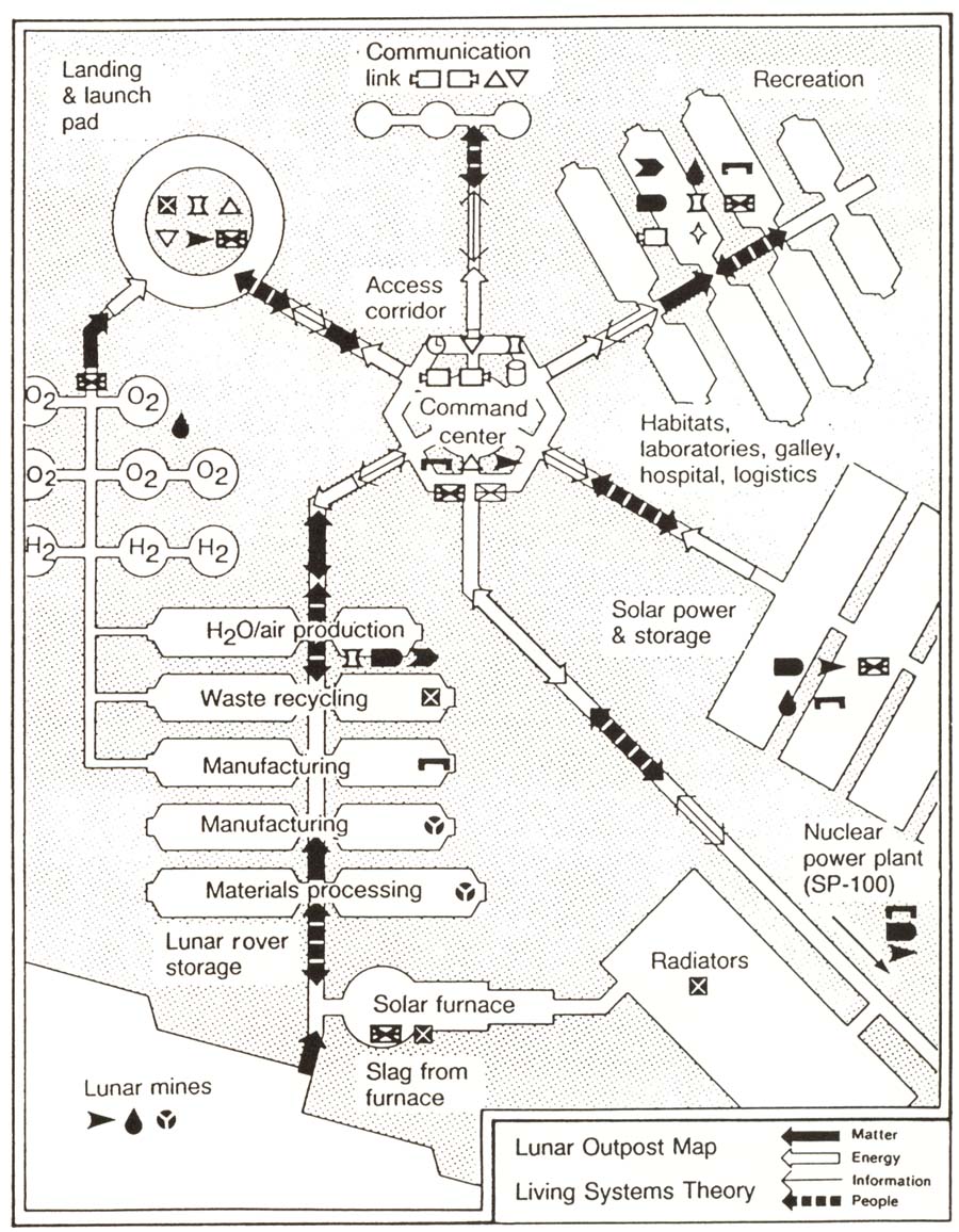 The general procedure for analyzing such systems is to map them in two- or three- dimensional space. This map of a lunar outpost indicates its subsystems and the major flows within it. Such an analysis would take into account the primary needs of human systems foraging for food and other necessary forms of matter and energy; feeding; fighting against environmental threats and stresses; fleeing from environmental dangers; and, in organizations which provide a comfortable, long-term habitat, perhaps reproducing the species. This study would analyze the effects on human social and individual behavior of such factors as weightlessness or 116 gravity; limited oxygen and water supplies; extreme temperatures; available light, heat, and power; varying patterns of light and dark, and so forth. A data bank or handbook could be developed of the values of multiple variables in each of the 20 subsystems of such a social system.