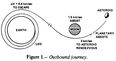 Besides the lunar-gravity-assisted maneuver, other possible maneuvers permit a considerable saving in deltaV requirements and hence in mass lifted to lowEarth orbit. These are described in reference 7 and are summarized as follows. Of the planets, only Earth and Venus are suitable for missions to Earth approaching asteroids because the other planets are either too small or too far away. The low-thrust EGA technique uses the Earth alone and is therefore always available. After launch from Earth, the mass driver imparts a small delta V to the system and causes it to re-intersect the Earth with a higher relative velocity than that with which it departed. These times of close encounter with the Earth offer excellent opportunities for crew rotation, about every 400 days, except during the trips to and from the asteroid. This relative velocity is changed in direction by the close Earth encounter, and the final Sun-centered velocity may be altered greatly.
