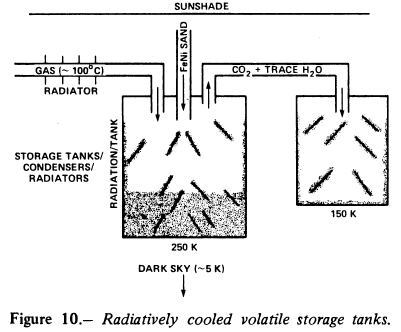 The energy requirements depend on the recovery rate, which is dominated by the heat of vaporization of water. Considering the various heat capacities of the phases, about 200 cal/g are required to raise raw C2 carbonaceous matrix material to about 700o C and to vaporize the volatile components. A 4-kg/sec throughput would require a solar collector about 60 m on a side focused on a collector area about 60 m across. Dust entrained in a carrier gas (~2-10 kg/m3) is introduced into a heat-exchange system at the mirror focus for a period of 30-60 sec. The dust is separated from the gas by a cyclonic separation (dust settles rapidly to the outer wall of a curved conduit). Counterflow of gas and dust is used to heat incoming stream and cool outgoing stream. The gas stream is directed to a shaded heat exchanger and into a storage tank that also serves as a heat exchanger. To condense all products to ~200 K, a radiator area must be about 100 m on a side. The heat released by condensing water may limit the total volatile recovery program. A double condenser system may solve some of this difficulty; the first tank operates near 250 K and precipitates much of the H2O (depending on vapor pressure) and hydrocarbons. A second tank operating near 150 K and at slightly elevated pressure condenses the remaining H2O and CO2 vapors (see fig. 10). The metallic sand is stored in both tanks to increase the thermal conductivity of the ices.