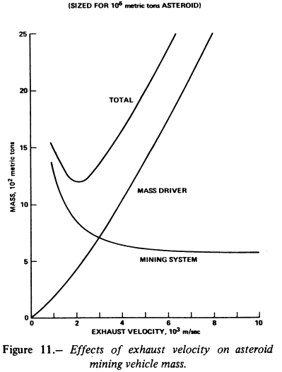 The estimated masses of an asteroid mining vehicle sized to capture a 106 -ton asteroid are shown in figure 11 as a function of mass-driver exhaust velocity. As exhaust velocity increases, the mass-driver mass increases sharply because of increasing power requirements, while the mass of the mining system including personnel accommodations decreases more slowly because the reaction mass throughput decreases.