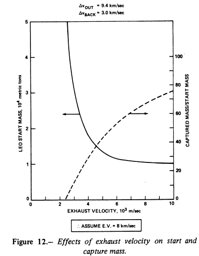 It is postulated that the asteroid can be captured by a single-stage mining vehicle starting from LEO, which attaches to the asteroid and returns with it to far Earth orbit. The required start mass in LEO is shown in figure 12 as a function of exhaust velocity for a typical mission requiring ideal velocity gain on the outbound trip of 9.4 km/sec (6.4 km/sec for escape and 3.0 km/sec for transit and rendezvous maneuvers) and 3.0 km/sec on the return trip. Since, in the range of feasible exhaust velocities, LEO start mass always decreases with increasing exhaust velocity, a value of 8.0 km/sec was selected and is used henceforth. For this value, the captured mass is 0.535X 106 tons.