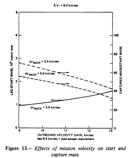 The sensitivity of LEO start mass and capture - the start mass ratio - to variations in outbound and return velocity requirements is shown in figure 13. Note that the post-escape outbound velocity requirement doubles, but there is no more than about a 45-percent increase in LEO start mass and a corresponding decrease in capture mass. Also, a 67 percent increase in return velocity requirement produces only a 21-percent reduction of capture to start mass ratio. Therefore, it can be concluded that a comfortable range of potential asteroid orbits can be accommodated without severe losses.