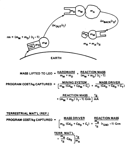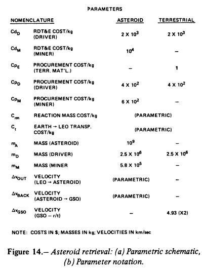 Figure 14(a) is a schematic of the asteroid capture mission; it also includes a parametric cost equation expressing total program costs per kilogram of asteroid captured. Also shown for comparison is a similar expression for the corresponding costs of terrestrial material. In the terrestrial case, it is postulated that the material is procured on Earth, transported to LEO, and then carried to geosynchronous orbit by the same mass driver as used in the asteroid case, which subsequently returns itself to LEO to pick up another cargo. In the terrestrial case, costs are amortized over a cumulative delivered mass equal to the asteroid capture mass, processed to the same degree. (Notation for the equations in fig. 14(a) and numerical values assumed are summarized in fig. 14(b).)