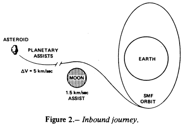 A representative scenario was developed for capturing a 106-to asteroid (see fig 1.). A single mass-driver is used to accelerate the crew and the equipment for mining and retrieval to rendezvous with the asteroid. That mass driver is then used to return a large fragment of the asteroid to Earth orbit. The scenario chosen uses a low-thrust delta V of 6.4 km/sec to achieve Earth-escape speed, a lunar gravity assist maneuver, and a further delta V of 3 km/sec to intersect and rendezvous with the asteroid. Also, in the outbound trip, one or more gravity-assisted maneuvers are used with Earth and perhaps Venus (ref. 7). Return delta V is taken to be 5 km/sec, including insertion into a 2:1 resonant SMF orbit (ref. 7)(see fig 2.) A mission to capture a portion of the asteroid 1977 HB was used as a basic mission (ref. 2).The results of this investigation are shown in table 1. In this case, which was not optimized but was arrived at by trial and error, the outbound delta V was intolerably large, even with gravity assist. But the return delta V was between 2 and 3 km/sec (the lower value obtainable with an extra Earth gravity assist). We concluded that, upon further analysis, opportunities will be found for missions to currently known asteroids in which either the inbound or outbound delta V is on the order of 3 km/sec, with the other leg larger. The strategy will be to find opportunities where some combination of both delta V values is minimized The 5-km/sec return delta V was chosen because lowering the delta V of the initial leg will most likely increase the final-leg velocities. As shown in a later section (Parametric Consideration of Asteroid Capture), these values are not critical to mission economics. Since the primary effort of the mission is to expend moving mass out of the Earth's gravity well, the cost per kilogram of returned asteroidal material will increase only slightly if the delta V values are increased by 2 or 3 km/sec. Nevertheless, the best opportunities should be identified.