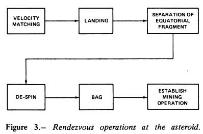 Rendezvous with the asteroid includes the following events (fig. 3): orbital matchings, fragmenting, despinning and bagging the asteroid, establishing the mining and processing operation, and packaging material for reaction mass and for return. Orbital matching is achieved in about 1 day, with a total velocity change of about 1 to 2 km/sec.