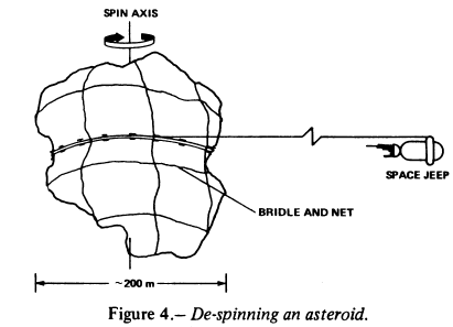 After rendezvous, a small jeep will land on the pole and its crew will find a suitable fragment of the asteroid for return to Earth. This fragment, which will have a mass of approximately 106 metric tons, will be near the equator and will be separated from the asteroid by a small chemical explosion. The jeep will then land on the detached mass and proceed to despin it. Asteroids rotate at different rates, but 4 revolutions/day may be considered representative of asteroids in the 100-m-diameter size range. A jeep will land at the pole of the fragment and establish a line of small Y-shaped pylons around its equator (fig. 4). These pylons will be either driven into the asteroid (if it is firm enough) or held in place by some kind of anchor. The jeep crew will then wind the asteroid in the direction of its rotation with 5 km of very lightweight cable, using the pilons to hold the cable. One end of this cable will be firmly anchored to the asteroid and the other end to the tug. Launching the jeep with a very minimal velocity to just escape the weak field of the asteroid would result in the cable being unwound as the asteroid rotates. A very tiny thrust from the jeep would be required to keep a light tension on the cable (a few Newtons), which would have a minimal effect on the despin operation. After 2 days, the cable will be unwound and will start to rewind in the other direction. The jeep will thrust against this with 34 N for 4 days (fig. 4). For an exhaust velocity of 4 km/sec, 29 tons of propellant will be used to despin the asteroid completely. Cable and pilons will be stored for return.