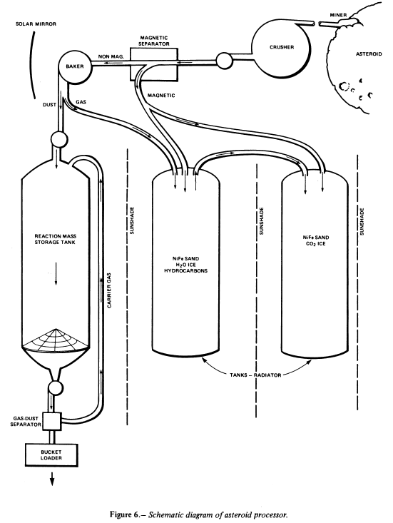 The cost of feasibility of mining and processing an asteroid for reaction mass, volatiles, and metals will depend greatly on the mass and associated costs of transporting equipment to the asteroid to accomplish these tasks. The necessary equipment includes that for mining and processing (crushers, metal and volatile extractors), storage containers, radiators, and support equipment (piping, blowers, "nets," and "bags"). An initial estimate of the mass of the necessary equipment can be made by fixing a preliminary design for each component and by then making a reasonable estimate as to the mass of that component. Certain elements of the proposed system are sized to a particular mass-flow rate. Each component is discussed briefly below and its associated mass is estimated.