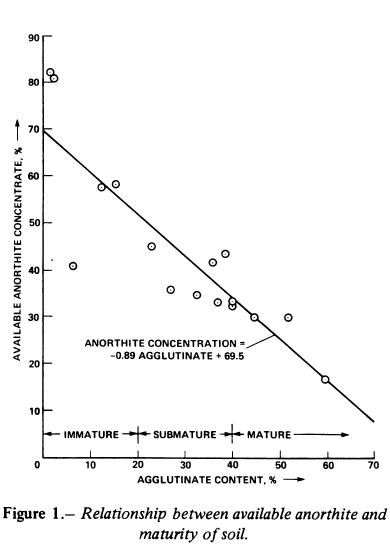 The amount of available anorthite must always be somewhat less than the normative anorthite. However, for a constant normative anorthite content, the amount of available anorthite depends strongly on soil maturity. This relationship is shown in figure 1, where the available anorthite concentrate is plotted against the agglutinate content for the soils in table 1. Agglutinates are impact produced glassy aggregates of glass, mineral, and lithic grains. The agglutinate abundance has been shown to be a useful index of surface exposure age of soil maturity (ref. 22). As agglutinate content increases, more of the aluminum in a soil is incorporated into the agglutinates, either in the glass itself or in feldspar grains engulfed and buried by the agglutinate glass. This aluminum cannot be concentrated by physical mineral separation techniques, so it is not available as an ore. Equally important is the dilution effect of the agglutinates on the recoverable anorthite concentrate. As shown in figure 1, , a mature soil has less available anorthite concentrate by a factor of 2 to 4 compared to an immature soil. The soils richest in available anorthite concentrate are the extremely immature soils with agglutinate contents less than 3 percent. Such soils are created by moderately large impact craters and are found at or near the surface close to fresh large craters.