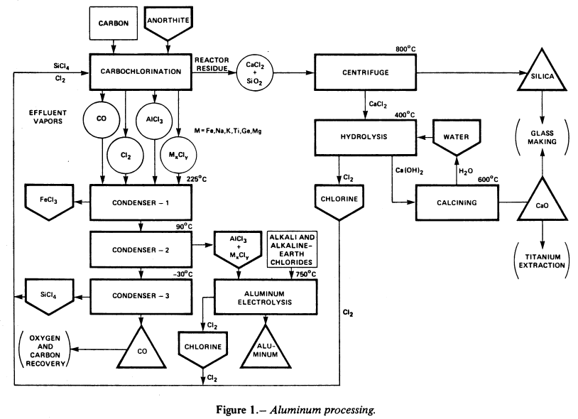 Alcoa electrolysis process- Since most of the technical aspects of this process for extracting Al from AlCl3 have already been worked out, further studies should be devoted to finding an electrolyte composition more suited to lunar conditions. The aluminum chloride obtained from the carbochlorination of lunar anorthite will contain some alkali and alkaline earth chlorides. Instead of purifying the chlorides, an electrolyte composition compatible with these chlorides must be obtained. This new composition might be obtained by only slightly modifying the electrolyte composition recommended in the Alcoa process for terrestrial conditions.