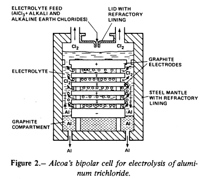 Because the technical details of the process are proprietary, only a brief outline and a discussion are given here. Figure 2 shows typical electrolyte cells. The feed consists of 3-10 weight percent of purified AlCl3 along with the required amounts of alkali and alkaline earth chlorides. Electrolysis is performed under inert conditions in a sealed cell consisting of 20 to 30 bipolar carbon electrodes stacked vertically at an interpolar distance of 1 cm. Each bipolar electrode behaves as a cathode on its top surface and as an anode on its bottom surface. During normal operation, all electrodes remain immersed in the electrolyte at an operating temperature of 700o � 30o C. A current density of 0.8-2.3 A/cm2 md a single-cell voltage of 2.7 V are typical operating conditions in the Alcoa process. Two typical compositions of the electrolyte (in weight percent) are: AlCl3(5), NaCl(53), LiCl(40), MgCl2(0.5), KCl(O.5), and CaCl2(1); and AlCl3(5 � 2), NaCl(53), and LiCl(42 � 2). The aluminum chloride concentration must be carefully controlled to ensure trouble-free operation. The AlCl3 concentration must be above a certain limit to prevent the discharge of alkali ions, which are detrimental to the electrodes as they form interchelation compounds with graphite. An upper limit is set by the high pressure of AlCl3. Also, the oxide content of the electrolyte must be as low as possible to prevent significant anode consumption with an attendant formation of an insoluble oxychloride sludge. An operating life of nearly 3 years is claimed for the electrodes when the oxide content of the electrolyte remains below 0.03 weight percent. The energy consumption of the cell is 9 kWhr/kg of aluminum produced.