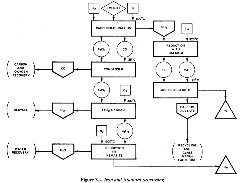 Titanium is commercially produced on Earth from ilmenite by a chlorination process and was described in an earlier study (ref. 5). In this process, iron. is separated from TiO2 by leaching with sulfuric acid after reducing ilmenite with coke or hydrogen at high temperatures. The residue (TiO2) is chlorinated in the presence of carbon to form TiCl4 which is further reduced by magnesium to yield titanium sponge. This process eliminates leaching at the final stages so that the dissolved hydrogen and oxygen content is minimum in the titanium. This helps to sustain the mechanical properties of titanium as well as to get pigment grade titania. While this is the most accepted process on Earth, and can be adapted for space operation; other alternatives are listed below.