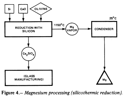 Olivine is the main source of magnesium. Olivine is scarce in the lunar samples and is found in the gangue material left after anorthite is extracted. The gangue, a mixture of olivine and several other impurities (such as faylite), does not appear to be a suitable raw material. The best nonterrestrial source of olivine would be from an asteroid. The composition of olivine concentrate from asteroidal sources is given in table 2 (T. Brunch, NASA-Ames Research Center, private communication).