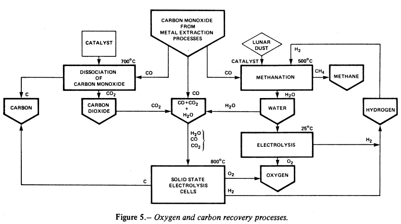As a by-product of the aforementioned metal extraction processes, large amounts of carbon monoxide are generated which can be profitably used to recover solid carbon and to generate O2, H2O, and CH4. For such recovery, three interdependent processes are envisioned (as illustrated in fig. 5). One simple method is to generate CO2 and deposit carbon by the disproportionation of CO on a suitable catalyst that uses the well-known Boudouard reaction: