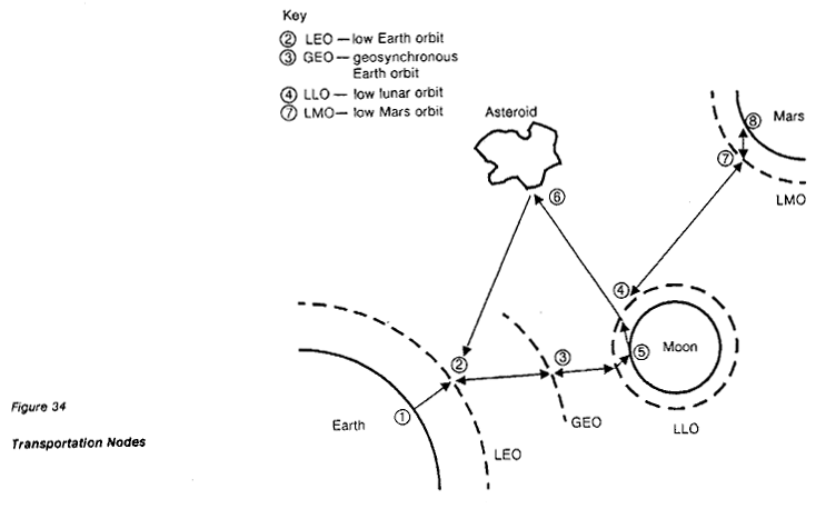 Beamed energy concepts offer an alternative for an advanced propulsion system. The use of a remote power source reduces the weight of the propulsion system in flight and this, combined with the high performance, provides significant payload gains. Within the context of this study's baseline scenario, two beamed energy propulsion concepts are potentially attractive: solar thermal propulsion and laser thermal propulsion. The conceived beamed energy propulsion devices generally provide low thrust (tens of pounds to hundreds of pounds); therefore, they are typically suggested for cargo transportation. For the baseline scenario, these propulsion systems can provide propulsion between the following nodes (see fig. 34 [Transportation Nodes]):