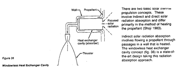 Indirect solar radiation absorption involves flowing a propellant through passages in a wall that is heated. The windowless heat exchanger cavity concept (fig.36 [Windowless Heat Exchanger Cavity]) is a state-of-the art design taking this radiation absorption approach.