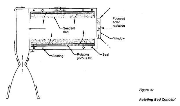 The rotating bed concept (fig. 37 [rotating Bed Concept]) is one of the preferred concepts for direct solar radiation absorption. Of the solar thermal propulsion concepts, it offers the highest specific impulse by using a retained seed (tantalum carbide or hafnium carbide) approach. The propellant flows through the porous walls of a rotating cylinder, picking up heat from the seeds, which are retained on the walls by centrifugal force. The carbides are stable at high temperatures and have excellent heat transfer properties.