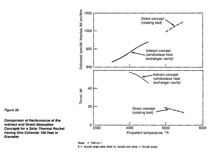 A comparison of the performance potential of the indirect and direct heating concepts for one collector with a diameter of 100 feet (30.5 meters) using hydrogen as propellant is presented in figure 38 [Comparison of Performance of the Indirect and Direct Absorption Concepts]. Because of limitations in wall material temperature (less than 50000 R or 2800 K), the indirect absorption concepts are limited to delivered specific impulses approaching 900 sec. The direct absorption concepts enable higher propellant temperatures and therefore higher specific impulses (approaching 1200 sec). Even the lower specific impulse represents a significant increase over that of conventional chemical propulsion, an increase that can provide substantial payload gains (45 percent for a LEO-to-GEO mission) at the expense of increased trip time (14 days compared to 10 hours).