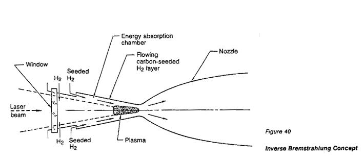 Laser thermal propulsion concepts can be grouped into continuous wave (CW) and repetitive pulsed (RP) concepts. The CW concepts include (1) indirect heating (heat exchanger), (2) molecular or particulate seedant, and (3) inverse Bremstrahlung. Details of these concepts are described by Caveny (1984). The inverse Bremstrahlung concept (fig. 40 [Inverse Bremstrahlung Concept]) enables the propellant to be taken to the highest temperatures (exceeding 10 000 degrees R or 5500 degrees K) and to be of the lowest molecular weight (approaching 1.0) through the formation of a high -temperature plasma and therefore results in the highest specific impulses (1000 to 2000 sec) of all the laser thermal propulsion concepts.