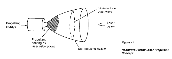 The repetitive pulse concept (fig. 41 [Repetitive Pulsed Laser Propulsion Concept]) uses a pulsed laser and a laser-supported detonation wave within the propellant to provide a rapidly pulsed, high-performance system.
