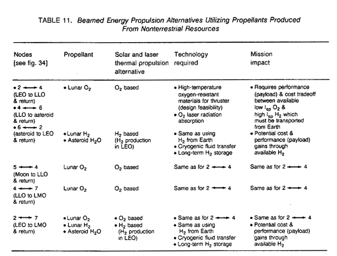 Beamed energy propulsion alternatives utilizing propellants produced from nonterrestrial resources are summarized in table 11 [Beamed Energy Propulsion Alternatives Utilizing Propellants Produced From Nonterrestrial Resources Graph]. In general, for both solar and laser thermal propulsion concepts, the availability of oxygen as propellant through lunar soil processing is not expected to be attractive because of the difficulty of achieving the required high-temperature oxygen-resistant materials for the thruster, the poor cooling capacity of oxygen, and the low specific impulse potential of oxygen. Even if these problems were solved, a performance and cost trade off analysis must be performed to quantify any gains. The oxygen would be available for missions originating from or returning to the lunar surface.