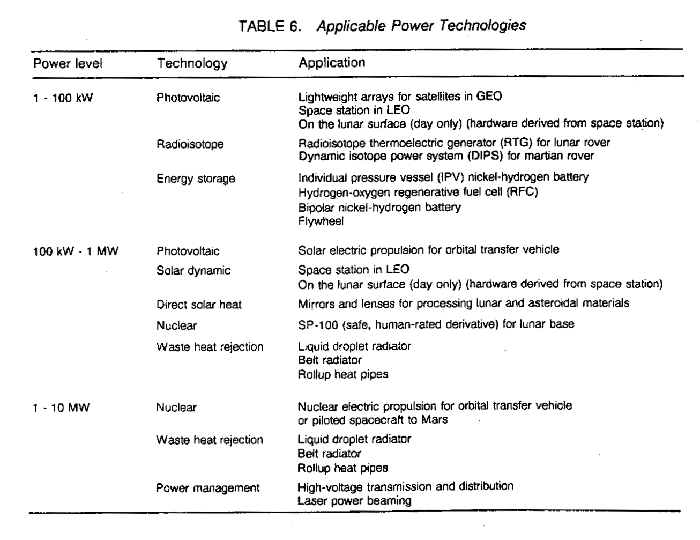 A list of envisioned applicable technologies related to power and energy supply for space activities at various power demand levels is shown in table 6 [Applicable Power Technologies table].