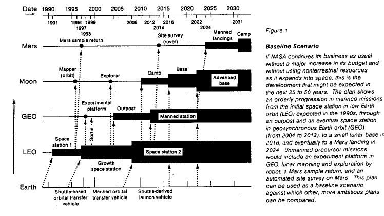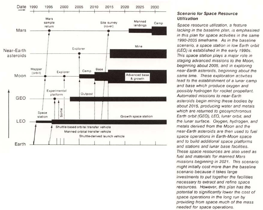 In the second scenario (fig. 2),[a baseline scenario graph] nonterrestrial resource utilization is assumed to be a goal. The paths are similar to those shown in the baseline scenario, but there is a heavier emphasis on movement to the Moon and establishment of a manned base there. Lunar materials are processed to get oxygen to support the transportation system in low Earth orbit (LEO). Selective mining of near-Earth asteroids is considered feasible. The lunar base and the production there enhance the move toward manned Mars exploration.